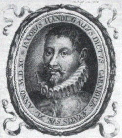 Jakob Handl, who often used the Latinized version of his name, Jacobus Gallus, on publications was born as Jakob Petelin in 1550 in Reifnitz, Carniola (now Ribnica), Slovenia. He left Slovenia in his youth, was probably educated in a Cistercian monastery, and travelled widely across Central Europe. He was a member of the Viennese court chapel in 1574, and was choirmaster (Kapellmeister) to the bishop of Olomouc, Moravia between 1579 (or 1580) and 1585. From 1585 to his death in 1591 he worked in Prague as organist to the church sv. Jan na Zábradlí.